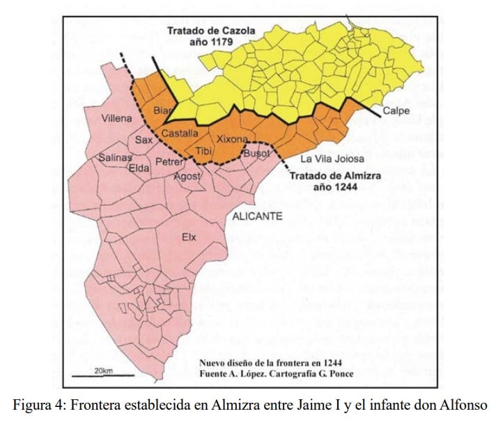 - Para Aragón: los territorios al norte de la línea que unía Biar – Busot – Villajoyosa, y que proseguiría hacia el sur a través de sierras y huertas hasta llegar al mar.
